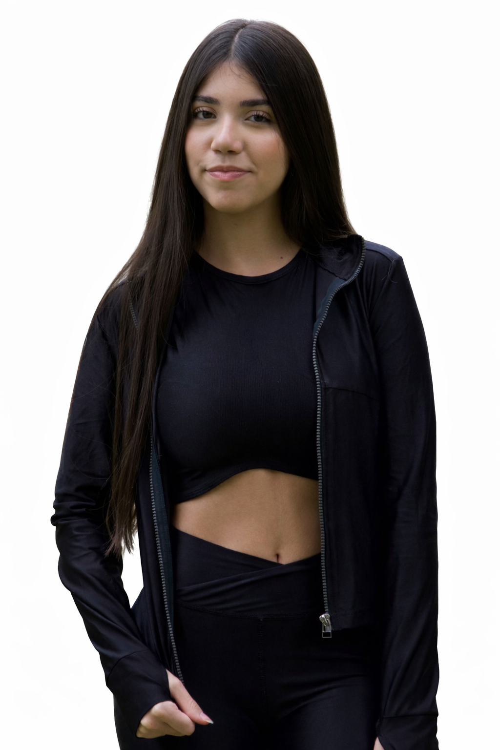 O top garante sustentação e liberdade; a legging modela o corpo com suavidade e firmeza; e a blusa acrescenta um toque aconchegante e sofisticado ao visual.